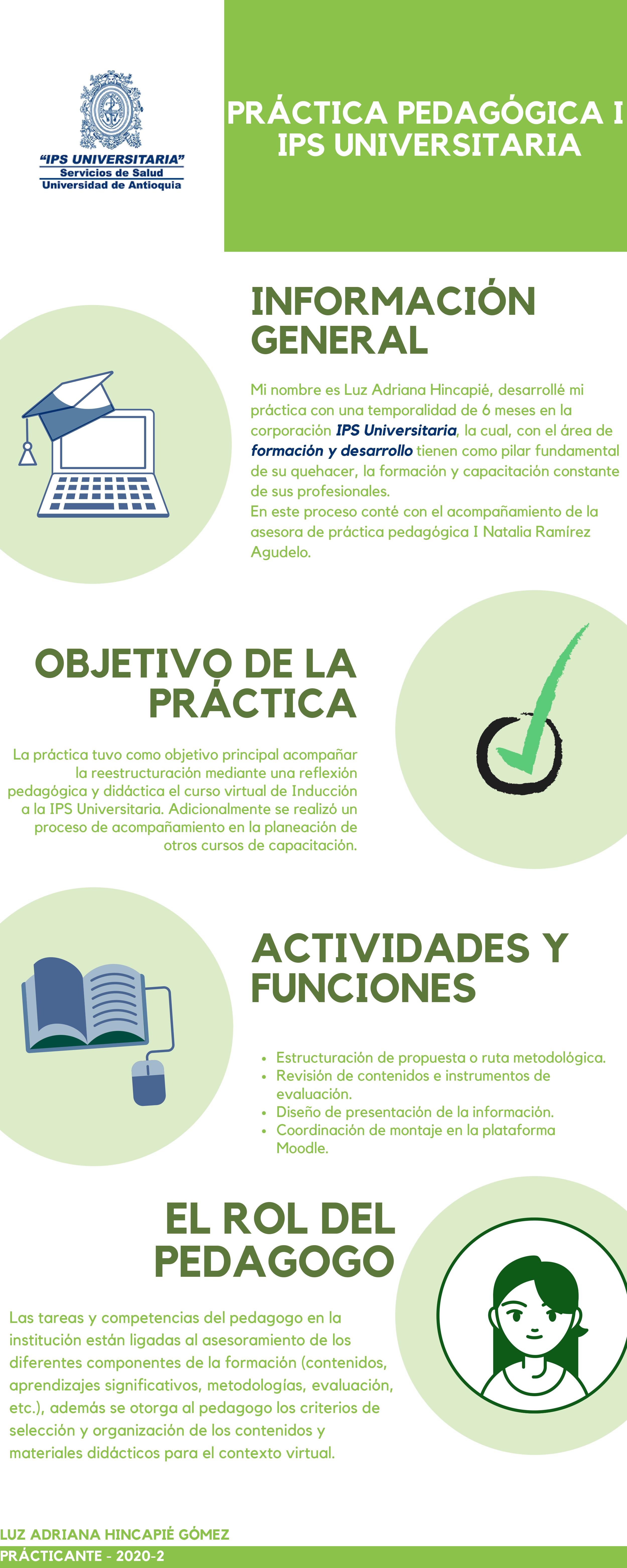 Se presenta una síntesis de la experiencia de práctica en la institución IPS Universitaria, en el área de Formación y Desarrollo, que tuvo como propósito acompañar desde una reflexión pedagógica y didáctica la reestructuración del curso virtual de inducción propuesto por la IPS.