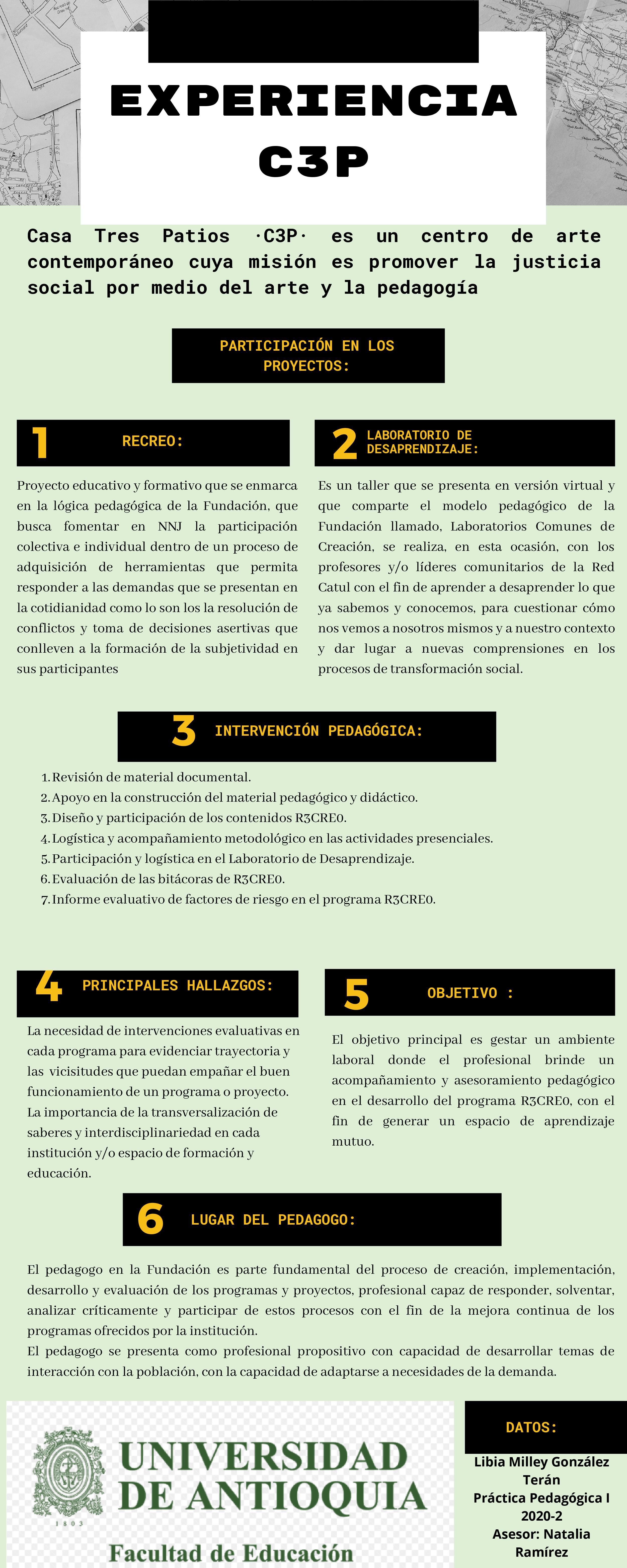 Esta infografía presenta una síntesis del trabajo realizado en la Fundación Casa Tres Patios en el marco de la Práctica Pedagógica I. La experiencia se centró en brindar un acompañamiento pedagógico que permitiera generar un espacio de aprendizaje mutuo y fortalecer el desarrollo de los programas de la Fundación.